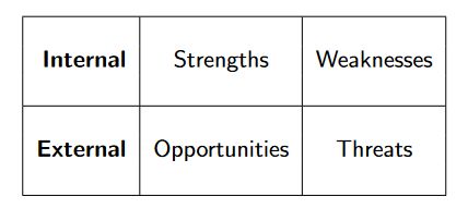 It also helps identify where an organization excel, that need improvement, potential opppertunies and threats that should be adressed